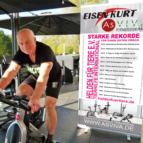 Dormagen / Stuttgart, 16. Oktober 2017 – Bei überraschend sommerlichen Hitzegraden trat Extremsportler Kurt Köhler (eisenkurt.eu) am gestrigen Sonntag fest in die Pedale seines AsVIVA Speedbike. Auf der Stuttgarter Benefizveranstaltung für den Verein „Helden für Tiere e.V.“ von TV-Host Ralf Seeger („Harte Hunde“ zu sehen auf VOX) sollte der Indoor-Geschwindigkeitsrekord auf einem Speedbike für einen guten Zweck fallen. Bei einer aktiven Wasserkühlung und Beschattung durch Sonnenschirme lief der 66-jährige Extremsportler heiß und verpasste nur knapp die anvisierte Bestmarke von 58 Kilometer in einer Stunde. Trotz „Wasserduschen“ schaffte Köhler auf dem Indoor Cycle nach 60 Minuten nur knapp 56 Kilometer. „Die erste halbe Stunde war schon richtig heiß“, sagt Köhler, der sichtlich vom Wetter überrascht war. „Aber das Ergebnis zeigt mir, dass da noch Luft nach oben ist.“ Seine hervorragende Leistung, die beweist, dass mit Fitness im Alter alles möglich sein kann, wurde von Ralf Seeger und seinen Gästen mit Lob, Anerkennung und Respekt gewürdigt. Für Kurt Köhler ist das nur ein weiterer Ansporn. „Ich möchte meinen nächsten Rekordversuch noch vor Weihnachten wahrscheinlich in München starten“, so Eisenkurt.