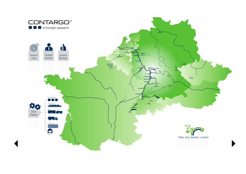 Neben dem farbenprächtigen Reptil wird das zentrale Marketinginstrument am Messestand eine interaktive Unternehmenspräsentation sein. Diese können sich Gäste auf zwei 46-Zoll-Bildschirmen ansehen und per Touch steuern. Gezeigt wird ein Überblick über die Contargo-Gruppe und ihre Standorte in Europa. Der Nutzer kann sich schnell durch die Präsentation navigieren, weil er – anders als bei einer gewöhnlichen Powerpoint-Präsentation – nicht benötigte Seiten einfach überspringen kann. Gezeigt werden Informationen über Contargo, Nachhaltigkeit, Transportmittel (Bahn, Lkw, Binnenschiff), weitere Dienstleistungen und IT-Produkte.