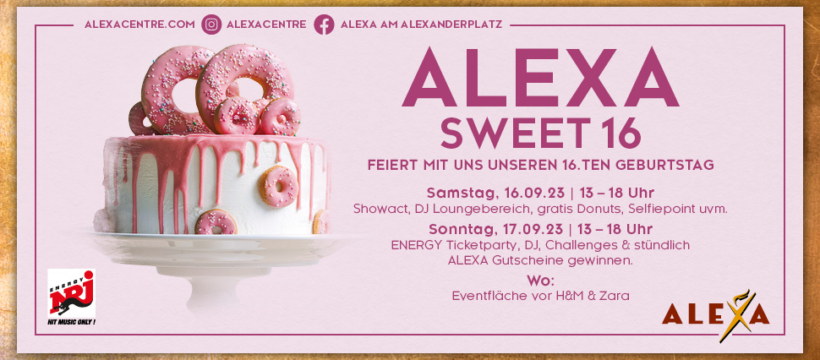 Let’s party! Das ALEXA am Alexanderplatz wird süße 16 Jahre alt und feiert dieses Jubiläum am 16. und 17. September mit einer großen Party unter dem Motto „Sweet 16“. Alle Besucherinnen und Besucher des beliebten Shopping- und Freizeitcenters sind zu einem bunten Programm mit Musik, Geburtstags-Donuts, DIY-Design und vielen Überraschungen eingeladen. Bei dem Geburtstagsgewinnspiel haben sie die Chance, einen 100-EUR-ALEXA-Gutschein zu gewinnen. Am Sonntag, dem 17. September empfangen die Läden des ALEXA von 13 bis 18 Uhr zum entspannten Shoppingbummel. Die „Sweet 16“-Aktionen finden auf der Eventfläche im Erdgeschoss statt. Die Teilnahme ist kostenlos.