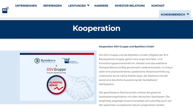 Deswegen kam es zu einer der größten Kooperationen in der Fintechwelt, die BytoWorx GmbH und die DSV-Gruppe werden zukünftig eng und exklusiv in Vertrieb und Entwicklung kooperieren. Die DSV-Gruppe ist der zentrale Dienstleister für die gesamte Sparkassen-Finanzgruppe mit einem Konzernumsatz von fast 650 Mio. EUR! Dies könnte der Anfang für weitere Zusammenarbeit seitens B+S und der Sparkassen-Finanzgruppe sein.