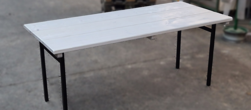 Das Bild zeigt einen Banketttisch mit Bohlen. Der Weiße Bohlentisch in Weiß ist klappbar, die geölte Lasur ist perfekt für den Außenbereich. Bei Öl ist der Vorteil das es bei bedarf nach zu streichen ist, das Teilweise nachstrichen ist ein Problem um Mängel auszubessern.