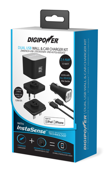 Avenel, USA, im Mai 2015 – Die Charger für alle Fälle: Ab sofort gibt es die Vorteile von DigiPower im Kombi-Paket. Der Hersteller bietet mit seinen cleveren Lösungen schnellstmögliches und akkuschonendes Laden von Smartphones und Tablets aller Art. Die eigens entwickelte InstaSense Technologie erkennt die Akkueigenschaften der angeschlossenen Geräte und stellt für jede Batterie die optimalen Ladewerte zur Verfügung. Nutzer der DigiPower Produkte sind somit auch für die Zukunft gerüstet. Wer gleich zwei Geräte nicht nur Zuhause, sondern auch im Auto laden möchte, ist mit dem neuen Lade-Set bestens versorgt. Das Package enthält je einen Ladesatz für Wand-Steckdosen und für Kfz Strom-Anschlüsse – beide ausgestattet mit zwei USB-Eingängen. 2,4 Ampere und 12 Watt sorgen für die notwendige Power. Ein mitgeliefertes Lightning- und ein Mikro USB-Kabel komplettieren das flexibel einsetzbare Set.