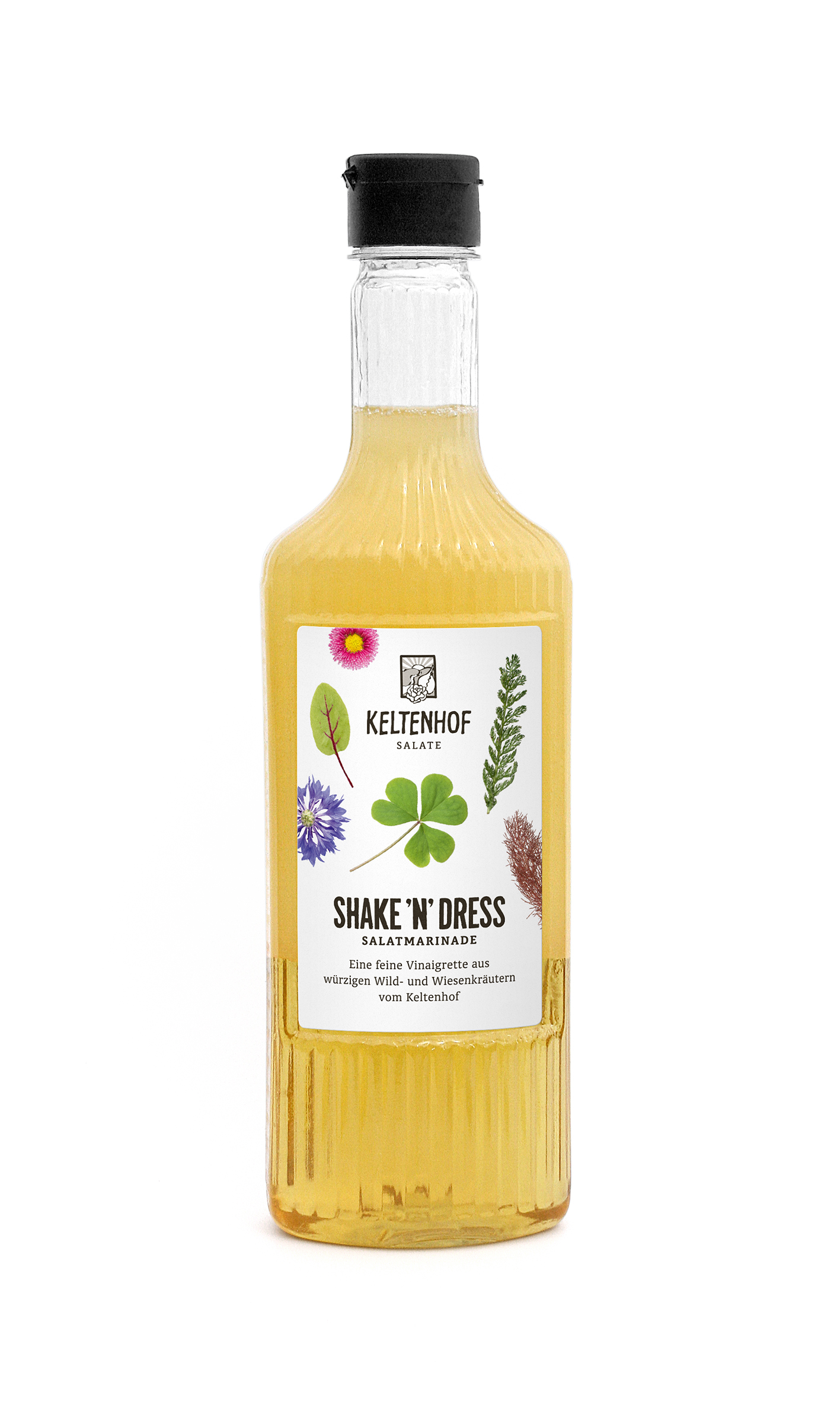 Das Flaschenetikett wurde vom Keltenhof entworfen, dort sind kleine Aufkleber der Kräuter zum Abziehen eingearbeitet, die auch in Shake n Dress enthalten sind, unter anderen Sauerklee, Tausendschön, Bronzefenchel und Schafgarbe.