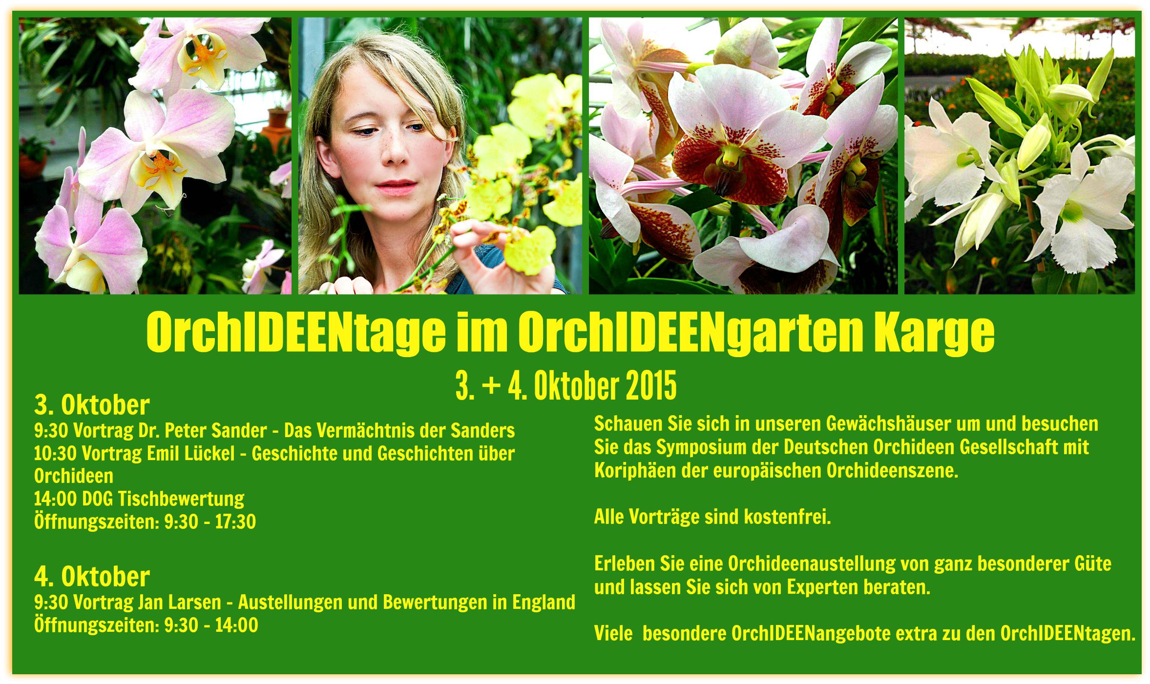 Vom 3. – 4. Oktober 2015 finden im Orchideengarten Karge in Dahlenburg die alljährlichen Orchideentage statt. Dieses Jahr wird zusätzlich ein Symposium der Deutschen Orchideen Gesellschaft stattfinden, zu dem alle Orchideenliebhaber eingeladen sind.