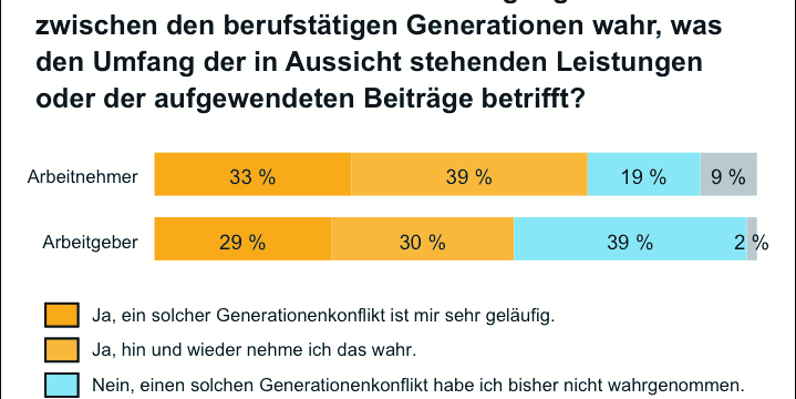 Der Generationenvertrag bei der Rente wird zum Konfliktherd: Arbeitnehmer über alle Altersstufen hinweg und Arbeitgeber nehmen Ungerechtigkeiten sowohl bei der gesetzlichen als auch der betrieblichen Altersversorgung (bAV) wahr. In den Unternehmen gibt es dringenden Handlungsbedarf, zumal bisher bei der bAV neue Versorgungsregelungen oft zu Lasten der jüngeren Generation gehen. Dies zeigt eine aktuelle Studie des Dienstleistungs- und Beratungsunternehmens Aon.