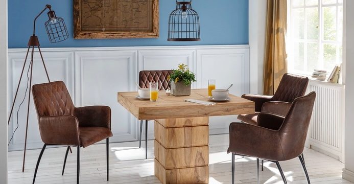 Herzstück der meisten Wohnungen ist der Essbereich. Auch bei wenig Platz muss niemand auf die beliebte Kombination aus Tisch und Stühlen verzichten. So ist der quadratische Esstisch Merlin im rustikalen Landhausstil nur 70 x 70 cm klein. Bei Model Motala aus Palisanderholz erweist sich die Form als besonders platzsparend:  Die 85 x 85 cm große Tischplatte ruht auf einer stabilen Säule. Die Stühle können daher von allen Seiten unter den Tisch geschoben werden und benötigen nur wenig Platz. Durch das außergewöhnliche Design wirkt der Tisch massiv und modern zugleich.
