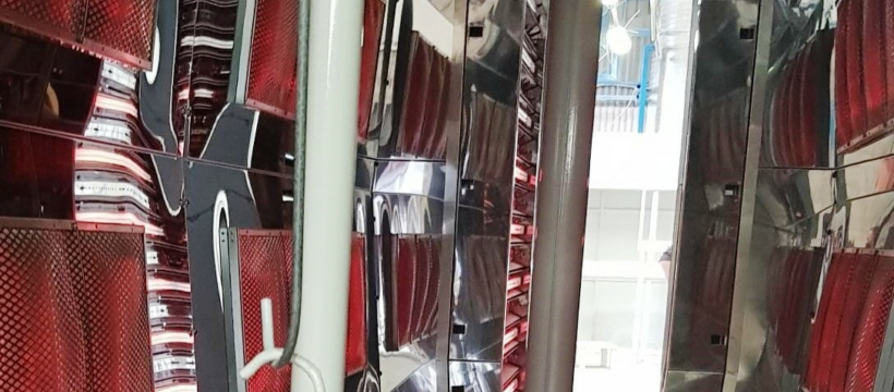 Die Infrarot-Spezialisten bei Heraeus Noblelight installierten einen modernen Infrarot-Ofen mit größerer Arbeitshöhe, so dass nun montierte Produkte bis zu einer Höhe von zwei Meter verarbeitet werden können. Um das Problem der Pulverablagerung auf den Platten zu lösen, installierte Heraeus Noblelight einen 120-kW-Infrarot-Booster vor dem Ofen. Der Booster ist in vier Zonen unterteilt und erwärmt das Pulver so schnell, dass es sich beim Eintritt in den Ofen in einem gelartigen Zustand befindet. Das minimiert die Pulververschleppung und verhindert eine Verunreinigung des Ofens.