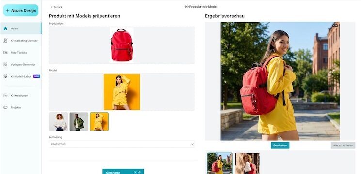 Ergänzend dazu bietet die Funktion KI-Produkt-Modelling die Möglichkeit, Produkte wie Accessoires, Sonnenbrillen oder andere Lifestyle-Artikel realitätsnah im Einsatz darzustellen, beispielsweise während sie getragen, gehalten oder genutzt werden. Hierfür können ebenfalls Fotos von Produkten und Personen hochgeladen oder passende Model-Vorlagen verwendet werden. Die KI erzeugt passende Produktbilder in verschiedenen Formaten für Social-Media-Anzeigen, Online-Shops und weitere Werbezwecke. Dabei lassen sich unterschiedliche Zielgruppen, Szenarien oder internationale Märkte ohne zusätzlichen Produktionsaufwand und Kosten abbilden.