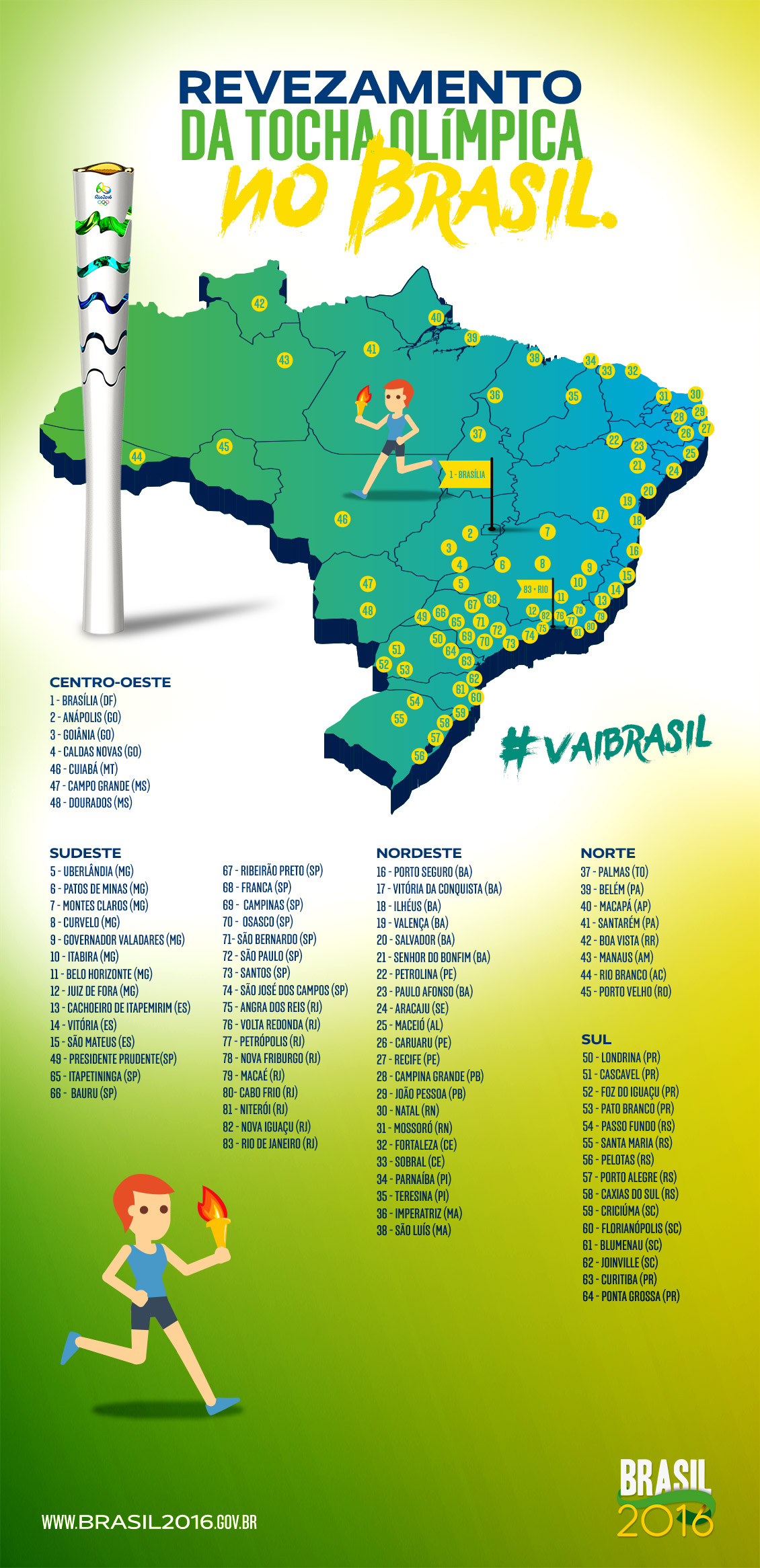 Brasília, 12. Mai 2016 Am 3. Mai startete in der Hauptstadt Brasília der Fackellauf des olympischen Feuers durch Brasilien. Die Reise der Fackel dauert drei Monate und sie durchquert in dieser Zeit 335 Orte, die auf ihre Weise jeweils ein Stück der Seele und der Lebensart Brasiliens widerspiegeln. Die Sehenswürdigkeiten dieser Orte sind in einer interaktiven Karte des brasilianischen Tourismusministeriums genauer erläutert.