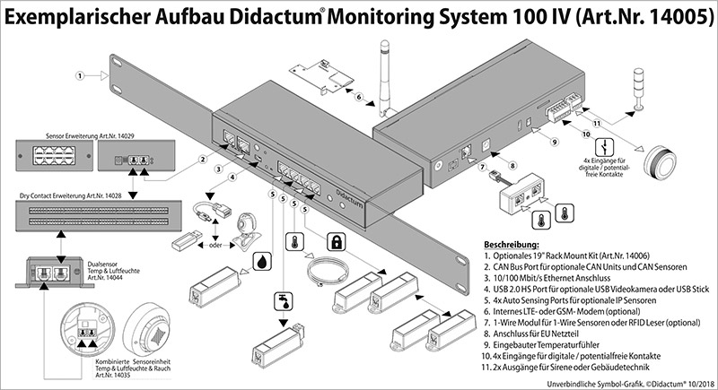 Treten in den zu überwachenden Räumen und Anlagen Gefahren oder Störungen ein, verschickt das smarte Überwachungssystem 100 IV Benachrichtigungen in Form von SNMP, E-Mail oder SMS (GSM bzw. LTE Modem nicht im Standard Lieferumfang enthalten). Optional bei Didactum lieferbare Blitzleuchten und Alarmsirenen können plötzlich eintretende Risiken und Gefahrensituationen melden. Das Monitoring System 100 IV kann auch für das Rack Monitoring vorhandener 19 Zoll Schränke in Technik-, Telekommunikations-, Serverraum- und Rechenzentrumsumgebungen eingesetzt werden.