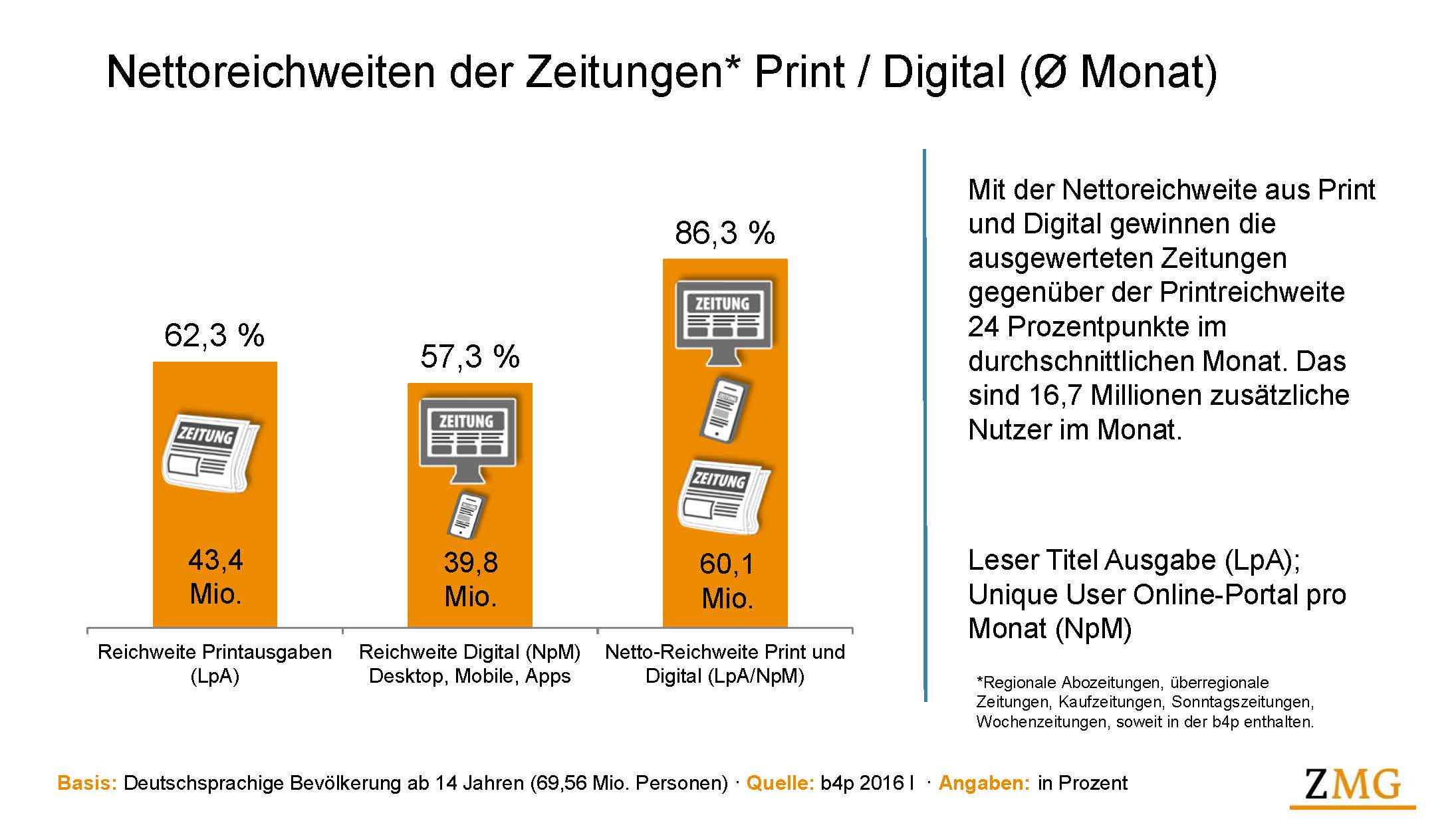 Für die Ermittlung der Netto-Reichweite zählt die ZMG jeden Leser nur einmal, egal wie oft er die Zeitung genutzt hat oder über welchen Kanal. Tatsächlich gibt es inzwischen viele Doppelnutzer: 39 Prozent bzw. 23,2 Millionen lesen regelmäßig sowohl eine Print- als auch eine Onlineausgabe der Zeitung.