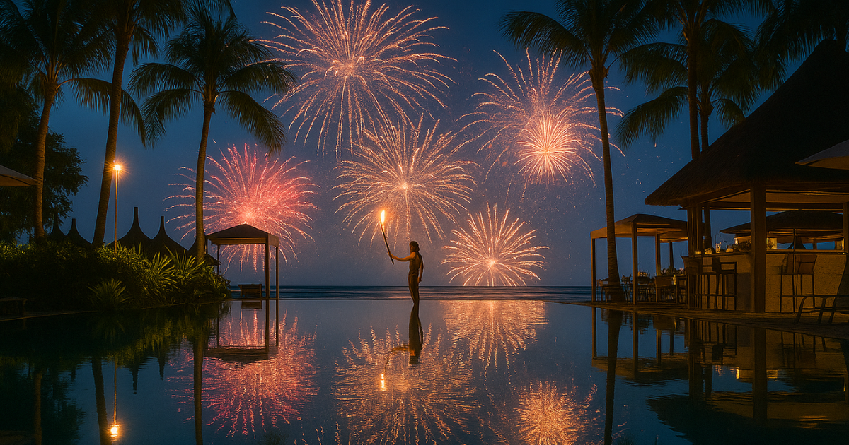 Feuerwerk über dem weltberühmten Flic-en-Flac Strand an der Westküste der Insel.