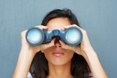 Pretty woman looking through binoculars against blue background
