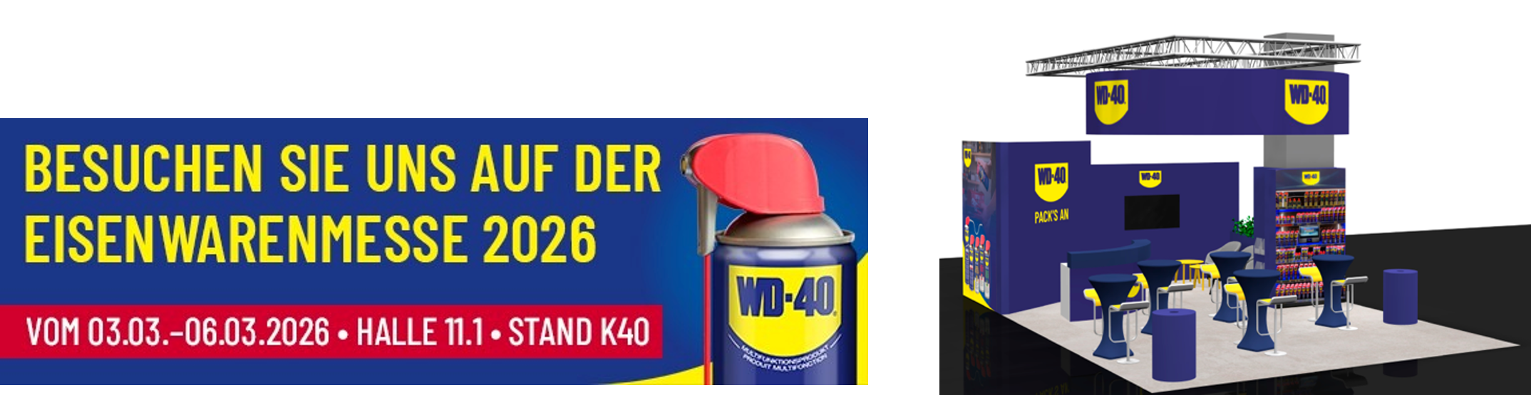 Im Jahr 2026 tritt die WD-40 Company Limited gemeinsam mit ihren europäischen Niederlassungen mit einem zentralen Gemeinschaftsstand auf. Mit einer Standfläche von 54 Quadratmetern realisiert das Unternehmen in Halle 11.1, Stand K40 ihren bislang größten Messeauftritt auf der Eisenwarenmesse.